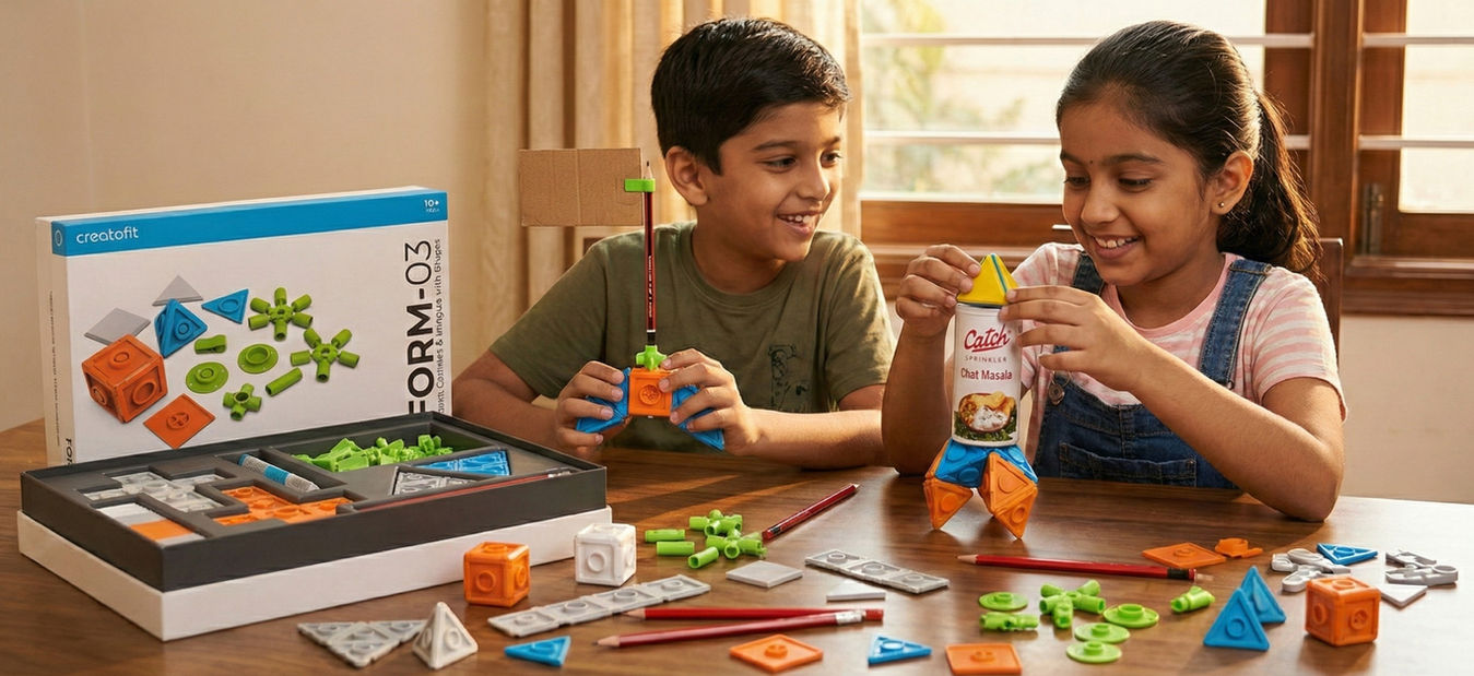 CreatoFit is a hands-on learning ecosystem that builds creative confidence in children by strengthening spatial thinking, material understanding, visual intelligence, and problem-solving—through structured play aligned with school learning and real-world design thinking.
